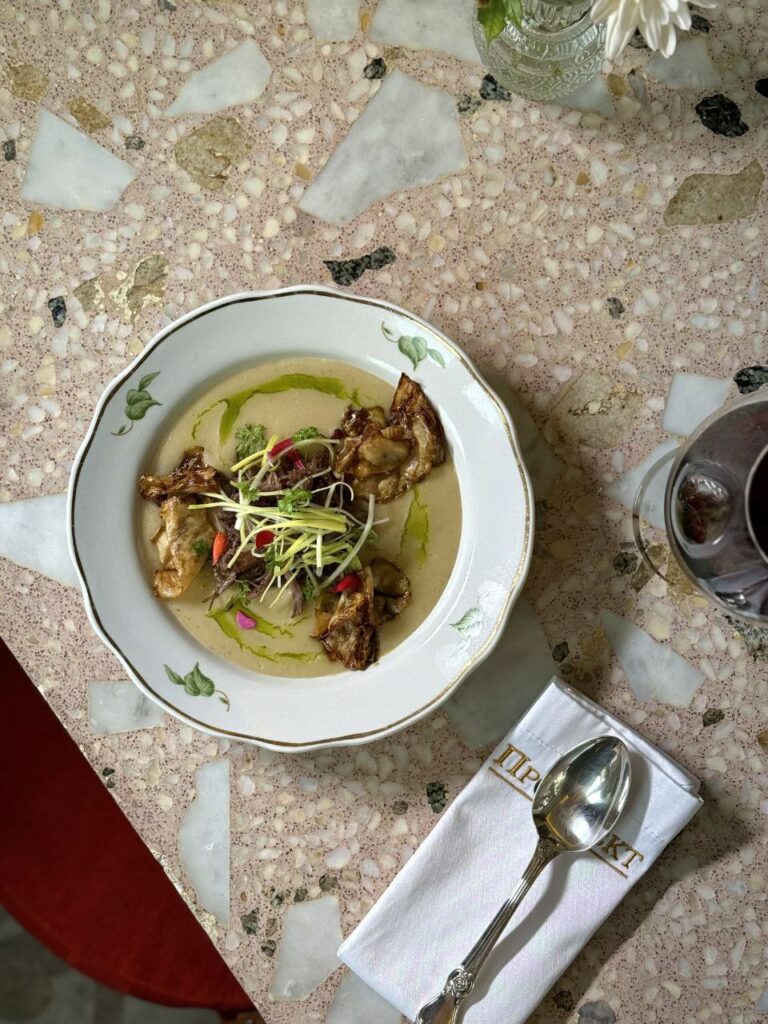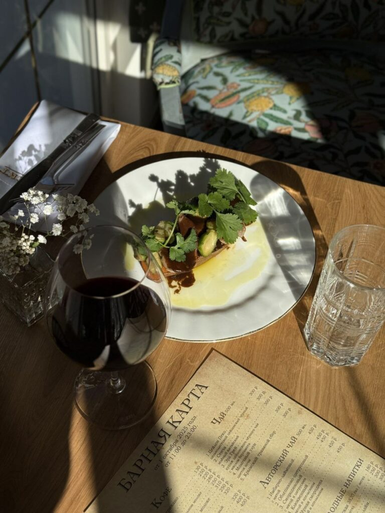 Шефа зовут Денис Козак. Меню лаконичное, состоящее преимущественно из местных продуктов. Винной карты пока что нет. Представлены только вина владельцев. Но это тестовый период, позже появятся крымские вина.