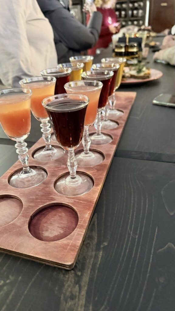На гастропрогулке «Вино и люди» с гидом Мариной Сипатовой мы побывали «На дне» (Нижний Новгород, Кожевенная, 11). В стопках голубика-черемуха на водке, шисо-клубника на джине, хренодер, крыжовник-эстрагон на джине и др. Тут всего это счастья 52 вида.