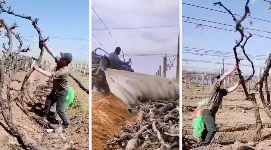В северном Китае зимние температуры опустились до уровня, который может погубить виноградную лозу. В ноябре, незадолго до наступления зимы, рабочие закапывают каждую лозу под слой земли. Весной процесс меняется на противоположный. Рабочие выкапывают спящие лозы, а потом привязывают их обратно к шпалере. Эта работа проводится почти повсеместно на севере Китая.